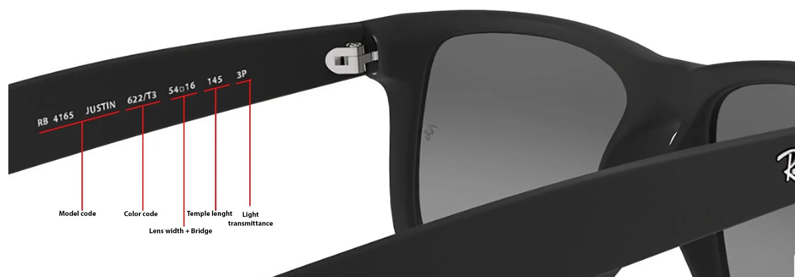 For this frame, you can see the model number RB4165 and the name Justin. The eye size, located before the square, is 54mm.